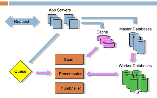 The blue arrows are what happens when a request comes in. Say someone submits a link or vote, it goes to the cache, master database, and job queue. Then they return to the user. Then the rest happens offline, those are represented by the pink arrows. Services like Spam, Precomputer, and Thumnailer read from the queue, do the work, and update database as required. Key piece of technology is RabbitMQ.