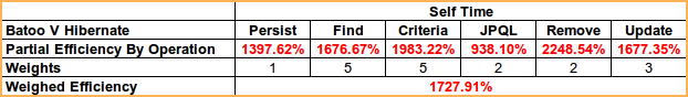Below are the ratios of CPU resources spent by Hibernate and Batoo JPA. It is assumed that an an application generates average 1 save, 5 locate, 2 remove and 3 update and 5 + 5 total of ten queries in ratios. Now although these numbers are extremely dependent on the application nature, some sort of assumption is needed to measure the overall speed comparison.