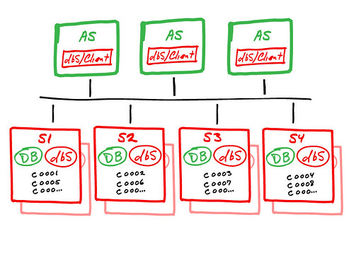 1. DB: The native DBMS (MySQL, Postgres, etc.). Since dbShards is database agnostic, and we rely on proven DBMS engines that have been around for years, we can take full advantage of these products in the sharded environment. This also means that we support the same SQL and client APIs that developers are used to. The dbS/Client communicates directly with the native DBMS, without any intervening middle-tier. This is a key to dbShards performance.