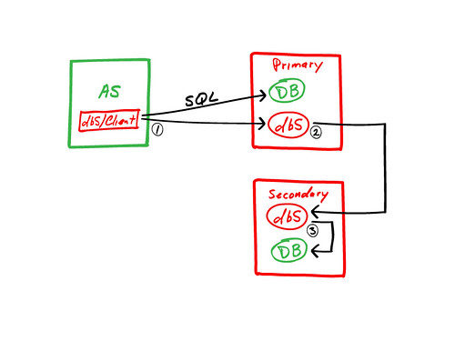 Note that each Shard Server has a Secondary server backing it up. This is another key to the dbShards approach, because when you add shards you are adding failure points. The design goal was clear: Provide full reliability for each shard (for planned and unplanned “hot” failover), in a high-performance, scalable implementation. After researching every existing database reliability technology, we came to the conclusion that this capability did not exist. All previous implementations were either too slow, or relied on shared components that would conflict with a pure “shared nothing” design. Based on this analysis, we developed dbS/Replicate, our reliable replication technology. For each shard, here is how the architecture works:
