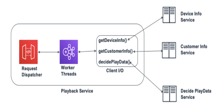 We have shown below the tweaked the code-snippet to effectively leverage the asynchronous architecture. For every playback request, the request-handler event pool triggers a worker thread to set up the entire execution flow. After that, one of the worker threads fetches customer-info from the related micro-service and another thread fetches the device information. Once a response is returned by both the worker threads, a separate execution unit bundles the two responses together and uses them for the decidePlayData() call. In such a process, all the context is passed as messages between separate threads. The asynchronous architecture not only helps by effectively leveraging the available computational resources but also reducing the latency.