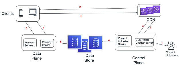 - Control Plane: This component will be responsible for uploading new content which will eventually be distributed across the CDNs. It will also be responsible for things such as file storage, sharding, data storage and interpretation of relevant telemetry about the playback experience. The major microservices in this component are listed below.