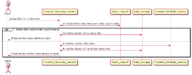This workflow is triggered when user searches for a video title and comprises of two microservices: Content Discovery Service and Content Similarity Service. The Content Discovery Service gets invoked when user requests for the video title. On the other hand, the Content Similarity Service returns the list of similar video title if the exact video title doesn’t exist in our data-store.