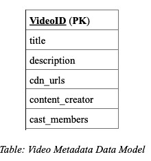 Within the scope of this problem, we need to persist video metadata and its subtitles in the database. The video metadata can be stored in an aggregate-oriented database and given that the values within the aggregate may be updated frequently, we can use a document-based store like MongoDB to store this information. The data-model for storing the metadata is shown in the table below.