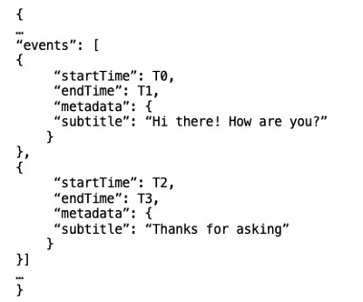 We can use a time-series database such as OpenTSDB, which builds on top of Cassandra, to store the sub-titles. We have shown below a snippet of the data-model which can be used to store video sub-titles. In this model(let’s call it Media Document), we have provided an event-based representation where each event occupies a time-interval on the timeline.