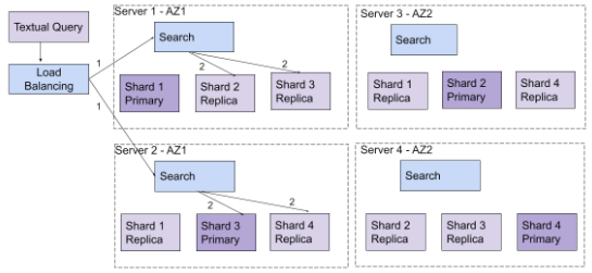 A load balancer selects one of the three copies of each shard to perform the query. The three copies allow three times more queries per second than with a single copy of the shard. In this setup, the machines are spread over two availability zones (AZ). Each AZ runs on as many different physical infrastructures as possible inside a cloud-provider region. The three copies are stored in a way where the first copy is 100% hosted on the first AZ, the second copy is 100% hosted on the second AZ, and the third copy is split between the two AZ. Schema 4 illustrates one query sent to the copy that is 100% hosted on the first AZ.