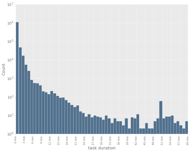 The graph below shows the distribution of task durations within the Iron.io platform for a particular period of time. As with the graph above, that the vertical count axis makes use a logarithmic scale which means that short-running tasks represent the vast majority of the total task volume. Each task is a stateless and ephemeral unit of work running independently from other tasks.