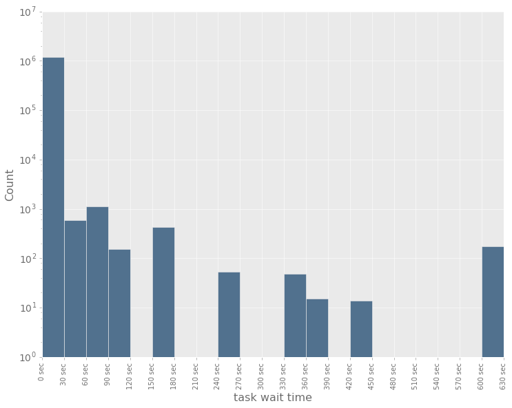 The graph below represents the task latency or wait time on a serverless platform for a particular snap shot of time. Note that the vertical count axis uses a logarithmic scale. The number indicate that the majority of tasks have very little wait time. (The outliers could be delayed tasks or certain batch jobs that are deprioritized to run with less restrictive SLAs.)