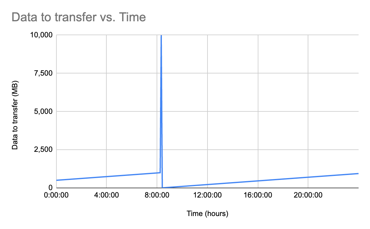 Figure 6 illustrates the volume of data transferred to replicas over time when shard 1 of figure 5 received a constant flow of 1000 update operations per minute. Every minute, 1000 indexing operations update the existing records in the shard. We transfer the updated level 0 file to replicas until we trigger a merge of level 0 with level 1 (reached when level 0 reaches 1GB). This merge happens a bit after 8 am and results in the transfer of the new level 0 file (10GB) to the replica.