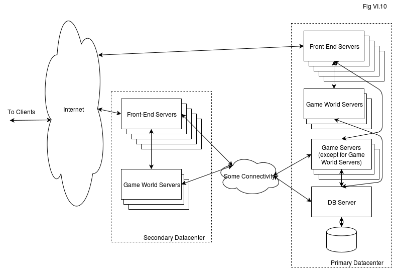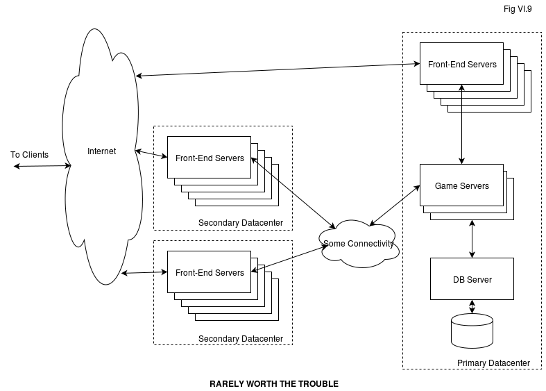 There is still a different reason to use such deployment architectures – in case if you want to protect yourself from Internet connectivity in your primary datacenter going down (provided that “Some Connectivity” survives); in practice, if you have a decent datacenter, it should never happen. More precisely – your datacenter WILL occasionally experience transient faults of around 1.5-2 minutes long (typical BGP convergence time), so if you’re looking for excuses to use this nice diagram on Fig VI.9 and your client can detect the fault and redirect to a different datacenter significantly faster than that, it MAY make some difference to your players.
