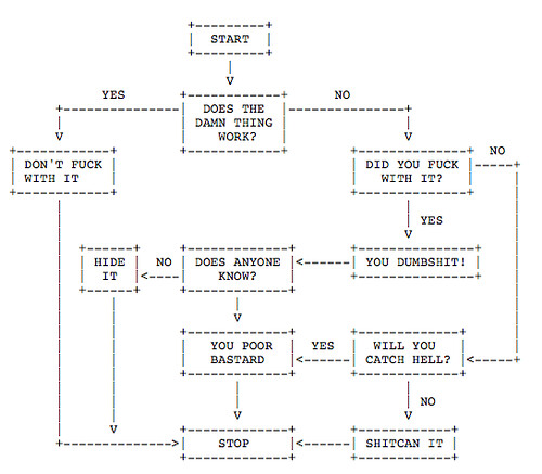 (Note: after this point the article contains a flow chart that is NSFW. Some people are very sensitive about cussing, so if that's you, please go back, don't read on. Danger! There are no nude pictures or anything, just some strong language. But this is my most favorite flow chart of all time, so it's worth it :-)
